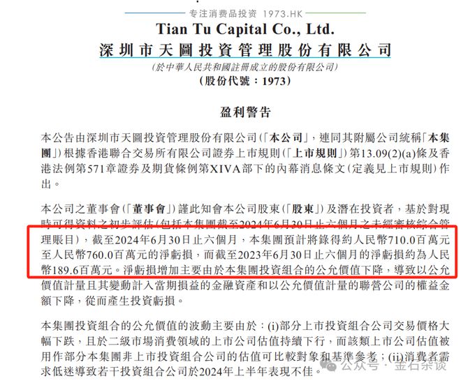 对于天图投资亏损,公司解释为投资组合交易价格大幅下跌,且于二级市场消费领域的上市公司估值持续下行;还有就是消费者需求低迷导致若干投资组合公司上半年表现不佳。