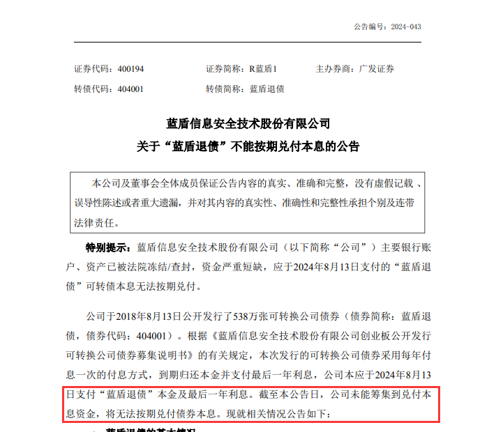 8月13日,蓝盾退债相关公告确认,由于公司(蓝盾信息安全技术股份有限公司)陷入债务危机及经营危机,巨额债务逾期未偿还,公司主要银行账户、资产已被法院冻结/查封,资金严重短缺,应于2024年8月13日支付的“蓝盾退债”可转债本息无法按期兑付。