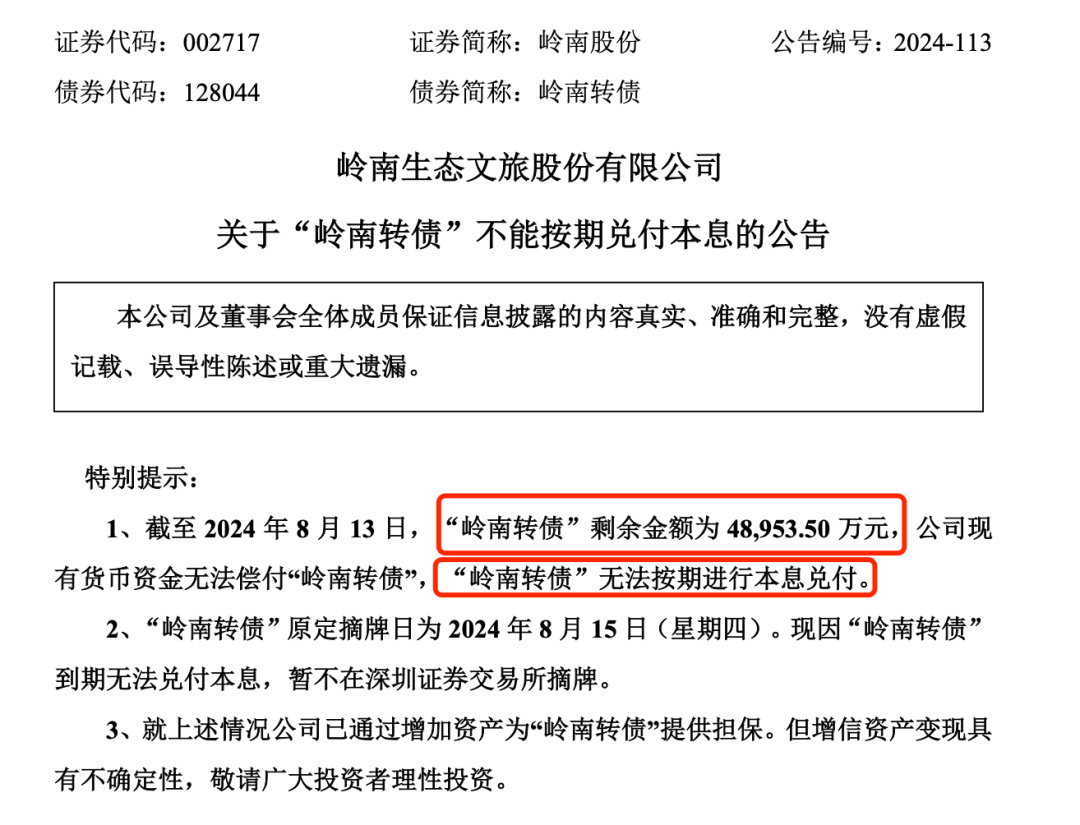 14日晚间,岭南股份公告称,截至8月13日,“岭南转债”剩余金额为4.89亿元,公司现有货币资金无法偿付“岭南转债”,“岭南转债”无法按期进行本息兑付。