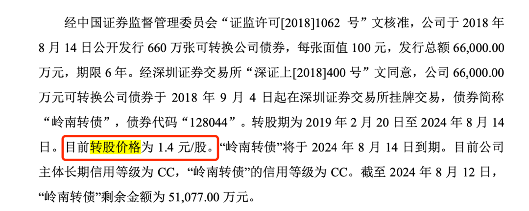 据岭南股份8月14日晚间公告,截至2024年8月13日,“岭南转债”剩余金额为4.90亿元,按照“岭南转债”发债所募集的6.6亿元,仅有1.7亿元的资金“脱身”。