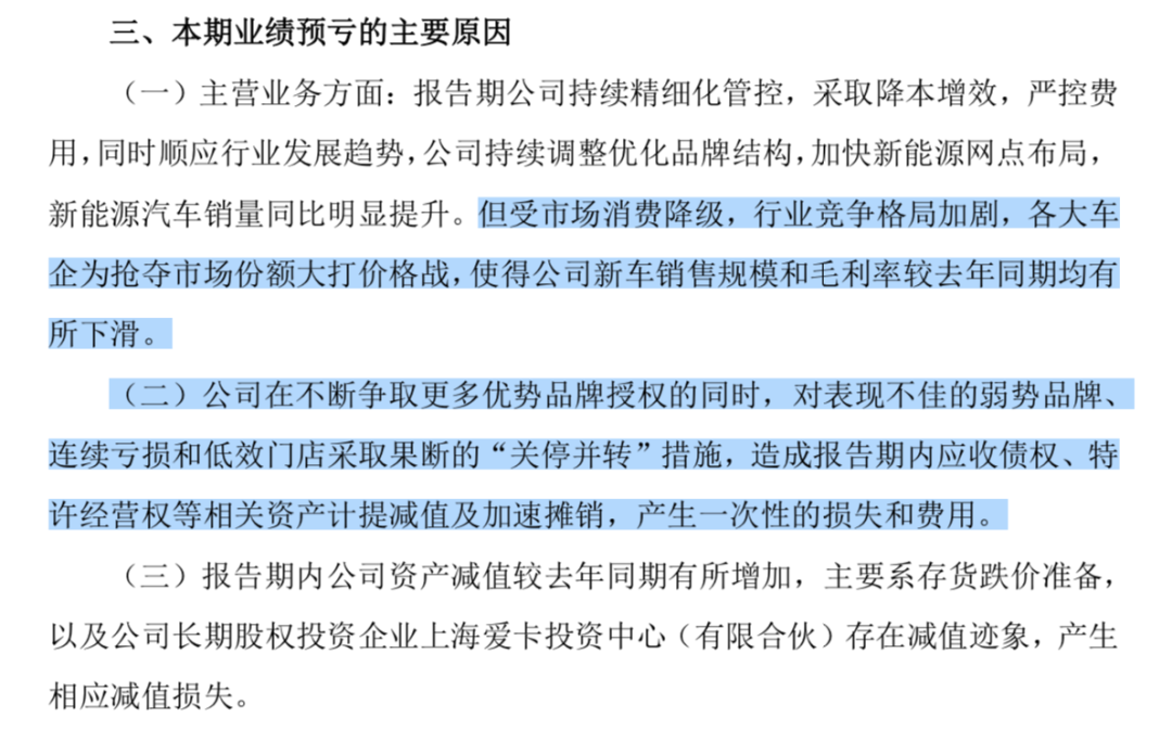 7月13日,广汇汽车发布2024年半年度业绩预告称,预计上半年归母净利润为-5.83亿元至-6.99亿元;扣除非经常性损益后的净利润为-7.56亿元至-8.72亿元。对于业绩预亏原因,广汇汽车解释,受市场消费降级,行业竞争格局加剧,各大车企为抢夺市场份额大打价格战,使公司新车销售规模和毛利率较去年同期均有所下滑。与此同时,公司对表现不佳的弱势品牌、连续亏损和低效门店采取果断的“关停并转”措施,造成报告期内应收债权、特许经营权等相关资产计提减值及加速摊销,产生一次性的损失和费用。