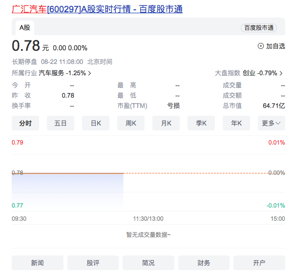 截至7月17日停牌前最后一个交易日,广汇汽车报收0.78元/股,总市值为64.71亿元。