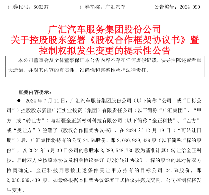 作为国内规模最大的汽车经销商集团之一,广汇汽车走到退市的地步确实令人唏嘘。在濒临退市之际,广汇汽车也曾尝试自救。7月11日,广汇汽车宣布,控股股东广汇集团已与金正科技签署框架协议,拟通过股权转让。协议约定,在2024年12月19日后,广汇集团将其所持广汇汽车24.5%股份转让给金正科技,交易完成后,公司控制权将发生变更。也就是说,届时广汇汽车将迎来新的控股股东。行业人士认为,广汇汽车拟变更控股权的背后是希望新的控股股东加入后能让其股价回归1元,消除“面值退市”的风险。遗憾的是,这一自救行为未能奏效。
