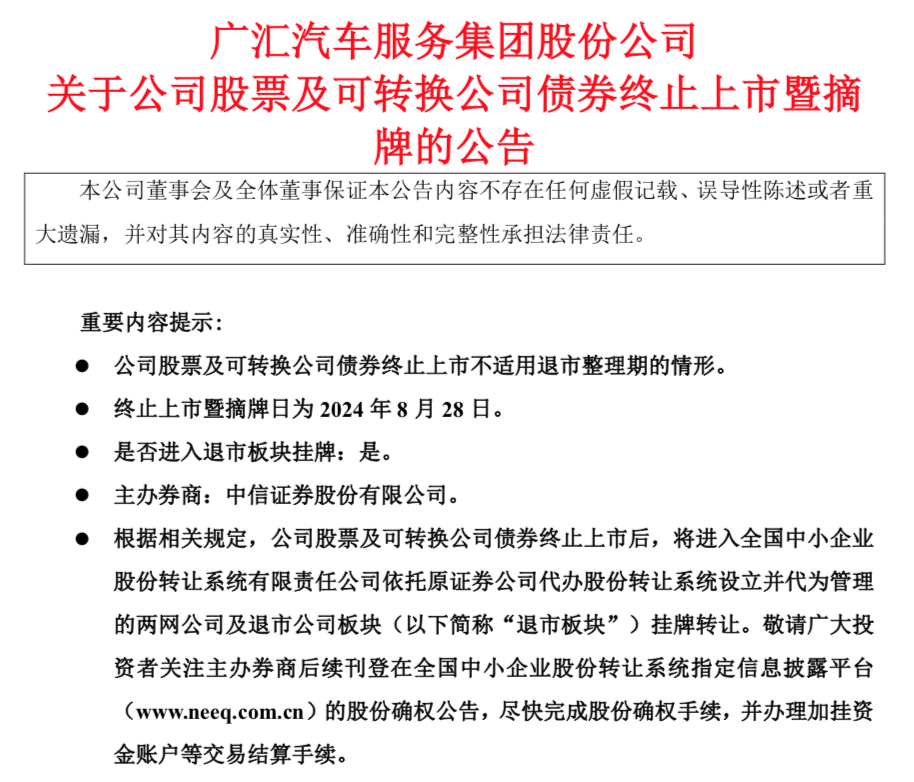 8月22日,广汇汽车服务集团股份公司(下称“广汇汽车”)发布关于公司股票及可转换公司债券终止上市暨摘牌公告。根据相关规定,公司股票及可转换公司债券终止上市后,将进入全国中小企业股份转让系统有限责任公司依托原证券公司代办股份转让系统设立并代为管理的两网公司及退市公司板块(下称“退市板块”)挂牌转让。