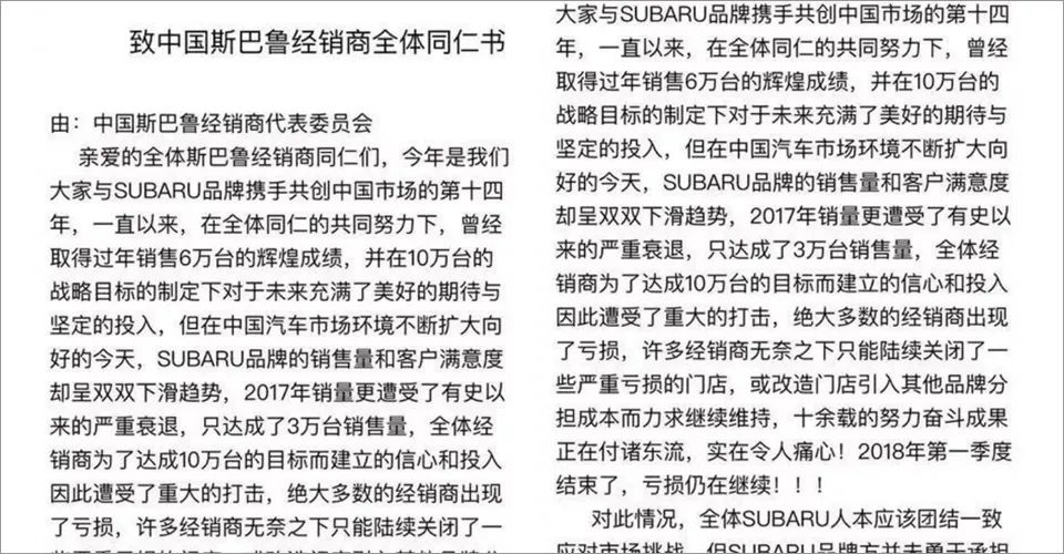 斯巴鲁的水土不服,令中国的经销商们举步维艰。在这样的销量成绩之下,国内斯巴鲁经销商的一纸《致中国斯巴鲁经销商全体同仁书》“逼宫”总部,这份“哭诉”信件在当时引起巨大反响。