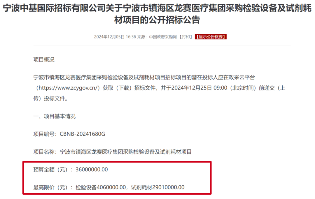 根据12月5日发布的招标公告显示,此次招标总预算为3600万。其中检验设备最高限价406万、试剂耗材最高限价2901万。