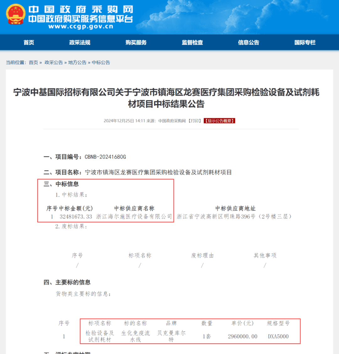 12月25日,中国政府采购网发布《宁波中基国际招标有限公司关于宁波市镇海区龙赛医疗集团采购检验设备及试剂耗材项目中标结果公告》,海尔施成功中标,成交金额约3248万!