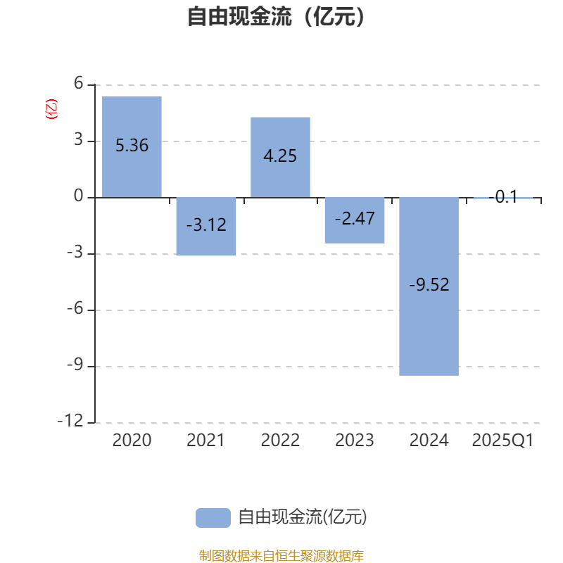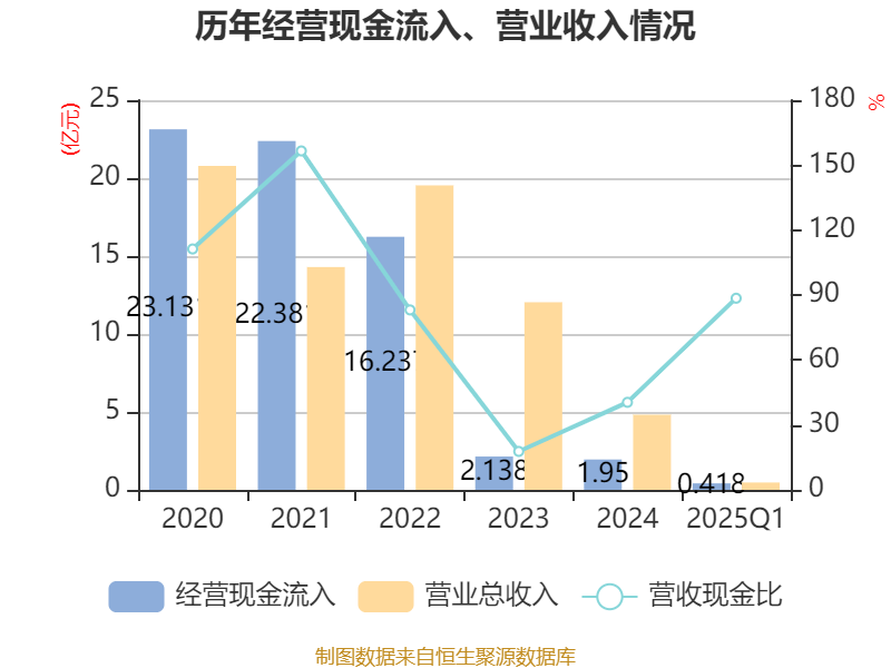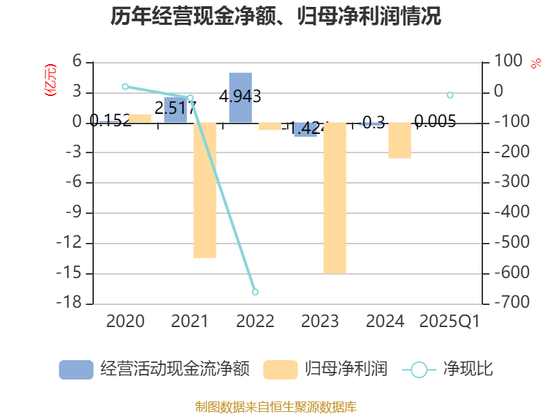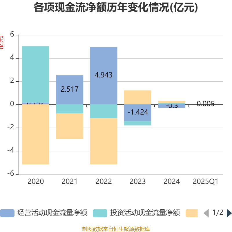 截至2025年一季度末,公司经营活动现金流净额为49.91万元,同比增加1205.91万元;筹资活动现金流净额169.98万元,同比减少1052.61万元;投资活动现金流净额-6.45万元,上年同期为-78.38万元。