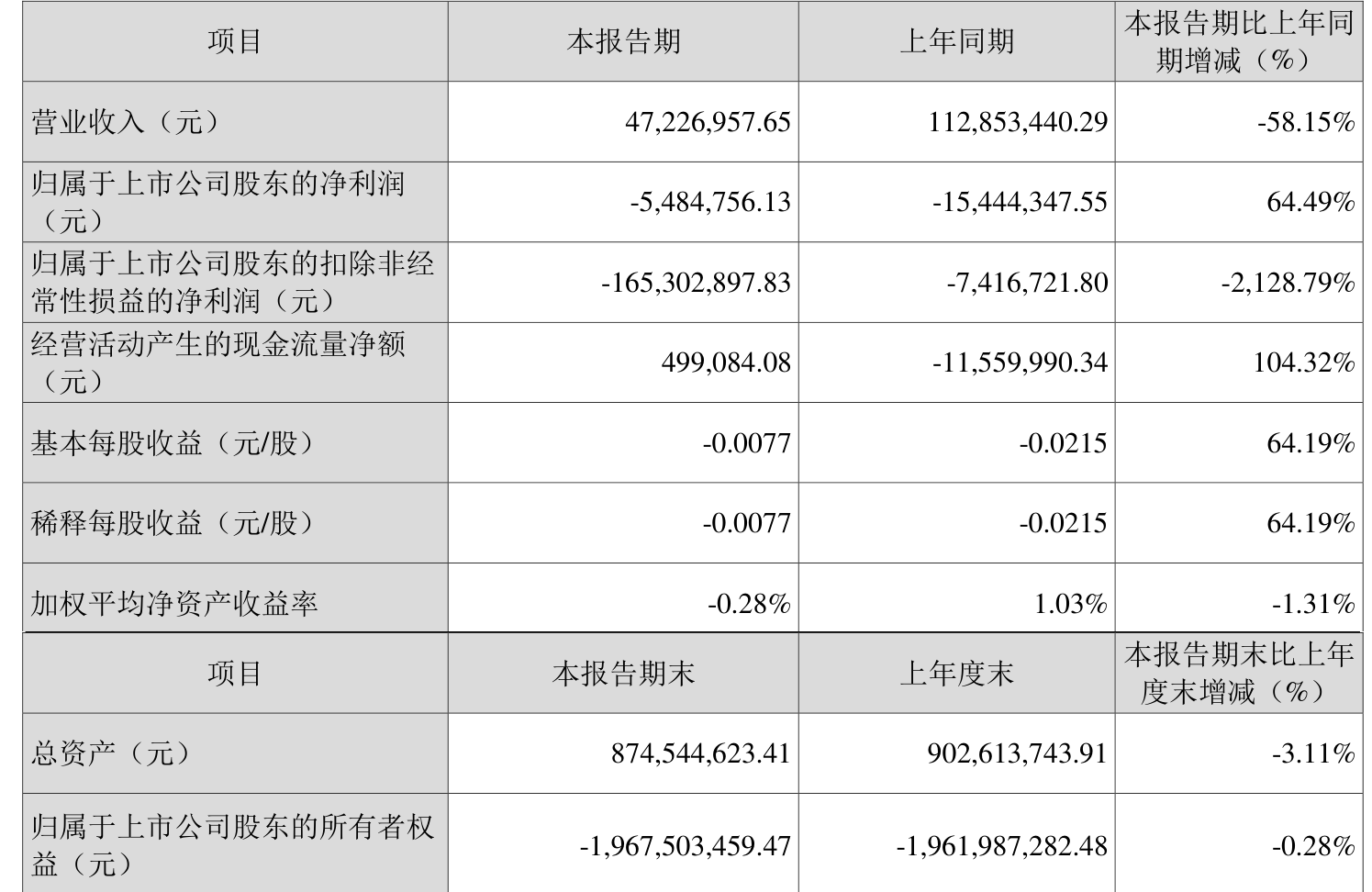 中证智能财讯*ST嘉寓(300117)4月26日披露2025年第一季度报告。公司实现营业总收入4722.7万元,同比下降58.15%;归母净利润亏损548.48万元,上年同期亏损1544.43万元;扣非净利润亏损1.65亿元,上年同期亏损741.67万元;经营活动产生的现金流量净额为49.91万元,上年同期为-1156万元;报告期内,*ST嘉寓基本每股收益为-0.0077元。