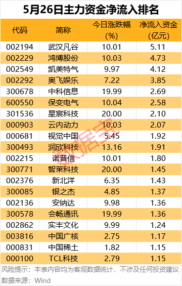 从个股看,沪深两市26股主力资金净流入超1亿元,8股获主力资金净流入均超2亿元。