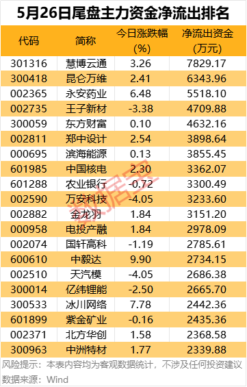 尾盘主力资金净流出方面,慧博云通、昆仑万维(维权)、永安药业、王子新材、东方财富尾盘净流出金额居前。