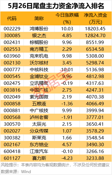 个股方面,鸿博股份、银之杰尾盘获主力资金净流入超1亿元;棕榈股份(维权)、南方精工(维权)、克来机电等尾盘获主力资金净流入均超5000万元。
