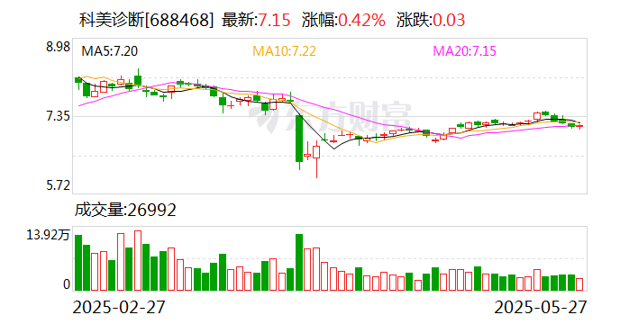 科美诊断5月27日大宗交易平台出现一笔成交,成交量60.00万股,成交金额425.40万元,大宗交易成交价为7.09元,相对今日收盘价折价0.84%。该笔交易的买方营业部为机构专用,卖方营业部为中信证券股份有限公司北京紫竹院路证券营业部。