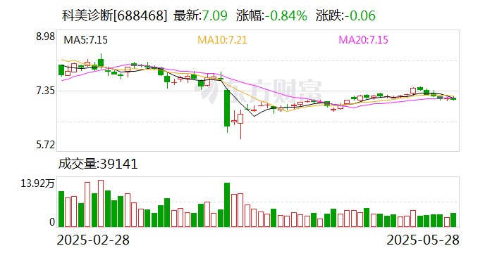 科美诊断5月28日大宗交易平台出现一笔成交,成交量60.00万股,成交金额421.80万元,大宗交易成交价为7.03元,相对今日收盘价折价0.85%。该笔交易的买方营业部为机构专用,卖方营业部为中信证券股份有限公司北京紫竹院路证券营业部。