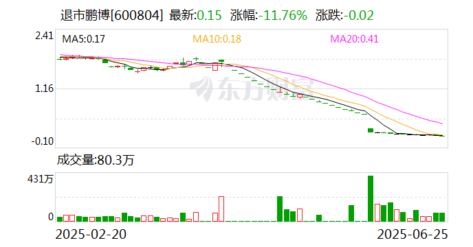 退市鹏博(维权)(600804)今日跌停,全天换手率5.77%,成交额1243.70万元,振幅13.33%。龙虎榜数据显示,营业部席位合计净卖出109.61万元。