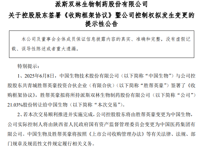 日前,派林生物发布公告称,公司控股股东胜帮英豪计划将所持21.03%的公司股份转让给中国生物。若交易顺利完成,中国生物将成为公司新任控股股东,公司实控人也将由陕西国资委变更为国药集团。