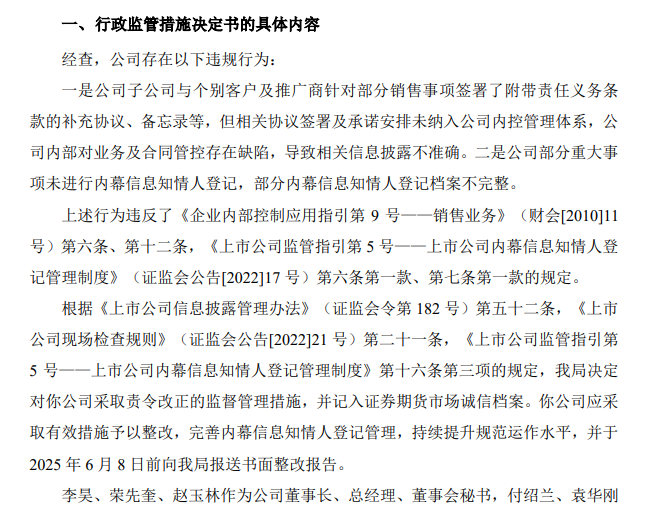 入主初期,外界对胜帮英豪寄予厚望,期待凭借陕煤集团的国资背景,能为派林生物在资源获取、业务拓展等方面提供助力 。但现实却不尽如人意,2025年5月,派林生物因内控问题遭到监管点名。山西证监局指出,公司在内部对业务及合同管控上存在严重缺陷,致使相关信息披露不准确,部分重大事项未进行内幕信息知情人登记,且部分内幕信息知情人登记档案不完整。受此影响,派林生物现任董事长李昊、总经理荣先奎、董事会秘书赵玉林以及时任董事长付绍兰、总经理袁华刚均被出具警示函。
