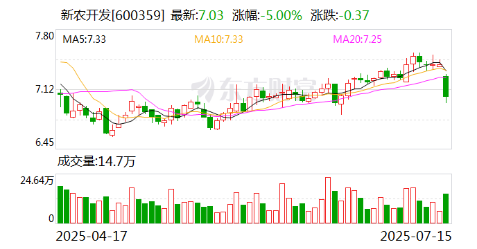 新农开发股价出现异动,截至今日10时13分,股价下跌5.27%,成交960.74万股,成交金额6850.29万元,换手率为2.52%,公司发布的最新业绩预告显示,预计上半年实现净利润1600.00万元—2200.00万元,净利润同比下降55.23%—67.44%。