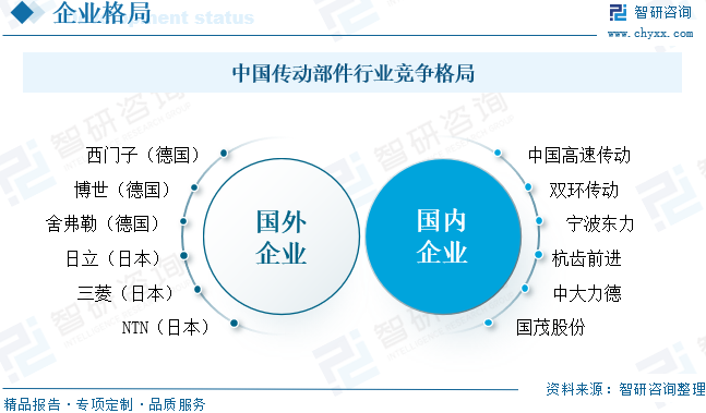 传动部件行业是一个全球化的行业,国内外企业在不同细分领域存在着激烈的竞争。在高端齿轮、链条、皮带等产品领域,国外企业如德国的西门子、博世、舍弗勒、日本的日立、三菱、NTN等具有较强的技术优势和品牌影响力,占据了较大的市场份额。在中低端齿轮、链条、皮带等产品领域,国内企业如中国高速传动、宁波东力、杭齿前进、双环传动、中大力德、国茂股份等具有较强的成本优势和市场拓展能力,形成了一定的竞争优势。