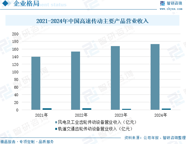 中国高速传动设备集团有限公司是一家以专业生产高速重载齿轮为主的大型企业集团。公司创建于1969年,并于2007年在香港上市。旗下品牌“NGC”是中国名牌及江苏省重点培育和发展的国际知名品牌,下辖业务:风电齿轮箱、轨道车辆齿轮箱、工业齿轮箱、机器人减速机、新能源汽车齿轮箱。中国传动以“为人类文明传递进步动力”为使命,定位为全球齿轮箱与传动技术解决方案的专家,公司拥有半个世纪的先进齿轮制造技术,产品广泛用于风电、轨道车辆、建材、冶金、高速、通用、矿山及橡塑机械等行业。尤其在清洁能源、低耗和高效领域,公司注重持续创新,是全球风能传动设备行业中增速快速、质量稳定、服务完善的供应商。数据显示,2024年中国高速传动风电及工业齿轮传动设备营业收入为172.66亿元,同比增长2.96%;轨道交通齿轮传动设备营业收入为3.39亿元,同比增长25.56%。