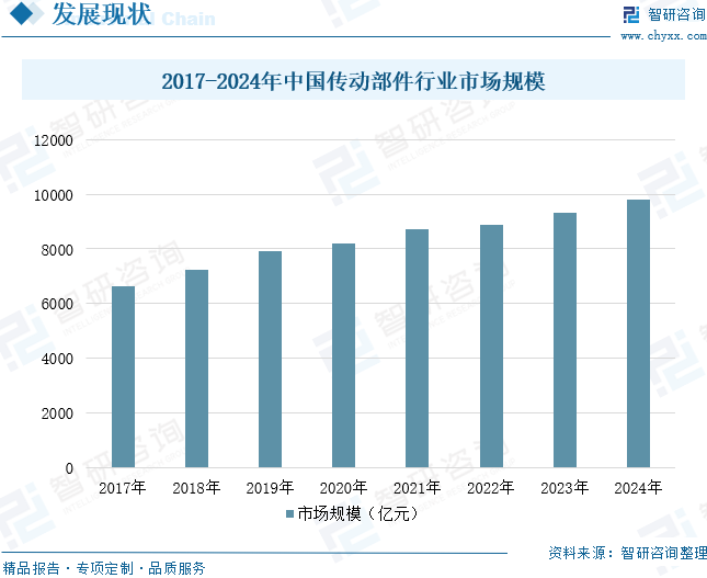 作为现代工业装备的核心组成部分,传动系统主要包括机械传动、液压传动、电气传动、流体传动四大类。其中,传动部件作为机械传动的一种机械元件,主要用于传递动力和转矩,将发动机、电动机等驱动机构的动力传递到其他机械部件,实现机械传动。近年来,随着国内经济的持续增长,基础设施建设、制造业升级、汽车工业扩张等领域的投资不断增加,对传动部件的需求也随之上升,这些领域的快速发展带动了传动部件市场的增长。与此同时,随着新材料、新工艺、新技术的不断涌现,传动部件产品的性能和效率得到显著提升,满足了更高性能和更严格标准的工业应用需求。在此背景下,中国传动部件市场规模持续扩大,年复合增长率保持在较高水平。数据显示,2024年中国传动部件市场规模约为9800亿元,成为全球最大的传动部件市场之一。未来,随着我国制造业的转型升级,高端装备制造、航空航天、汽车等领域对精密传动部件的需求将日益增长。