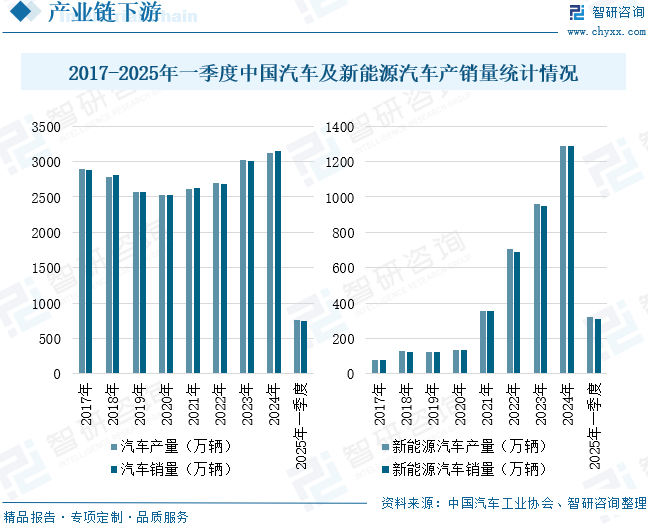 汽车是传动部件行业最重要的下游领域之一,其对传动部件的需求量大、品种多、质量高。汽车中使用的传动部件主要包括变速箱、差速器、驱动桥、转向系统、制动系统等。随着汽车工业的创新发展,尤其是新能源汽车、智能网联汽车等技术的快速发展,对传动部件的性能和品种提出了更高的要求,推动了传动部件行业的技术进步和产业升级。中国汽车工业协会数据显示,中国汽车产量从2017年的2901.5万辆增长至2024年的3128.2万辆,年复合增长率为1.08%;销量从2017年的2887.9万辆增长至2024年的3143.6万辆,年复合增长率为1.22%。2025年一季度,中国汽车产销量分别为756.1万辆和747万辆,同比分别增长14.5%和11.2%。其中,新能源汽车产量从2017年的79.4万辆增长至2024年的1288.8万辆,年复合增长率为48.91%;销量从2017年的77.7万辆增长至2024年的1286.6万辆,年复合增长率为49.33%。2025年一季度,中国新能源汽车产销量分别为318.2万辆和307.5万辆,同比分别增长50.4%和47.1%。随着我国经济高质量发展持续推进,居民消费水平的不断提高,城镇化进程的加快推进,以及国家对新能源汽车、智能网联汽车等新技术的大力支持,我国汽车市场将保持稳定增长态势,对传动部件行业将形成稳定而强劲的需求。
