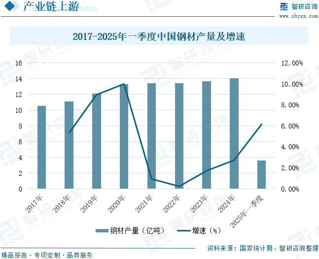 传动部件通常由钢材制成,因为钢材具有更高的强度、更好的耐磨性和抗腐蚀性,经过加热处理后,其机械性能可以得到进一步提升,满足传动部件在高负荷、高转速环境下的工作要求。此外,钢材还具有良好的加工性能,便于制造成各种复杂形状的传动部件。近年来,随着中国经济的持续快速增长,钢铁产业也迎来了前所未有的发展机遇。其中,中国钢材年产量连续多年稳居全球首位,且产量规模不断扩大。数据显示,中国钢材产量从2017年的10.5亿吨增长至2024年的14亿吨,年复合增长率为4.2%。2025年一季度,中国钢材产量为3.59亿吨,同比增长6.1%。钢材产量的逐年增长不仅满足了国内制造业对高品质钢材的需求,也为传动部件产业链提供了稳定的原材料供应。
