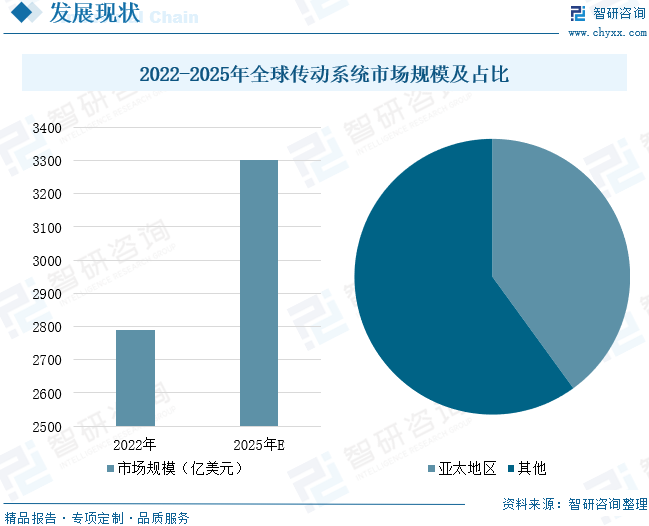 传动系统作为各类交通工具中动力传递的核心装置,其本质就是由各类传动部件组成的有机整体。在汽车、船舶、飞机等交通工具中,传动系统通过离合器、变速器(或分速器)、万向节、驱动轴、轴承、齿轮等关键传动部件的协同工作,将发动机产生的动力高效传递至驱动轮或螺旋桨等执行机构。这些传动部件通过精密配合与优化组合,共同构成了完整的动力传输链。当前全球传动系统市场呈现持续增长态势,数据显示,2022年全球传动系统市场规模为2790亿美元,预计到2025年将达到3300亿美元,年复合增长率为5.76%。其中,亚太地区是全球最大的传动系统市场,占全球市场份额的40%以上。