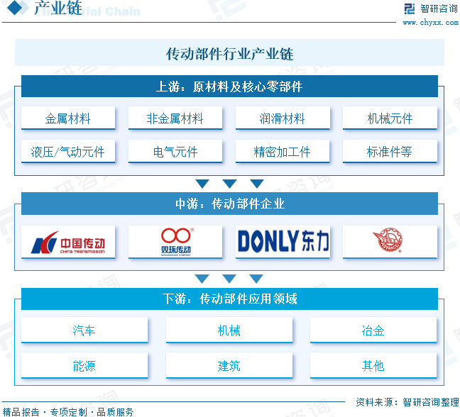 当前,中国传动部件行业已经形成较为完整的产业链,涵盖了从原材料生产到产品研发、设计、制造、销售及服务的全过程。产业链上游为原材料和核心零部件,其中,原材料包括金属材料、非金属材料、润滑材料等;核心零部件包括机械元件、液压/气动原件、电气元件、精密加工件、标准件等。产业链中游为齿轮、链条、皮带、联轴器等传动部件产品的生产制造。产业链下游为应用领域,包括汽车、机械、冶金、能源、建筑等多个领域。