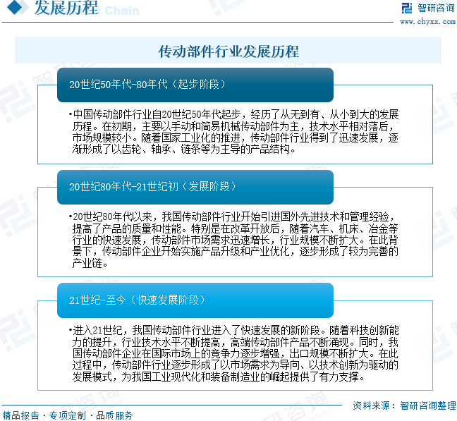 中国传动部件行业自20世纪50年代起步,经历了从无到有、从小到大的发展历程。在初期,主要以手动和简易机械传动部件为主,技术水平相对落后,市场规模较小。随着国家工业化的推进,传动部件行业得到了迅速发展,逐渐形成了以齿轮、轴承、链条等为主导的产品结构。20世纪80年代以来,我国传动部件行业开始引进国外先进技术和管理经验,提高了产品的质量和性能。特别是在改革开放后,随着汽车、机床、冶金等行业的快速发展,传动部件市场需求迅速增长,行业规模不断扩大。在此背景下,传动部件企业开始实施产品升级和产业优化,逐步形成了较为完善的产业链。进入21世纪,我国传动部件行业进入了快速发展的新阶段。随着科技创新能力的提升,行业技术水平不断提高,高端传动部件产品不断涌现。同时,我国传动部件企业在国际市场上的竞争力逐步增强,出口规模不断扩大。在此过程中,传动部件行业逐步形成了以市场需求为导向、以技术创新为驱动的发展模式,为我国工业现代化和装备制造业的崛起提供了有力支撑。