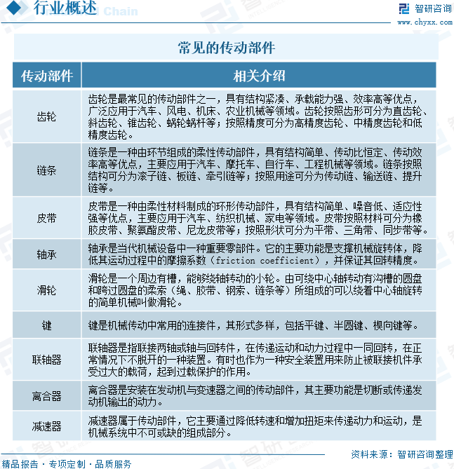 传动部件是机械设备中用于传递动力和运动的重要零部件,包括齿轮、链条、皮带、轴承、滑轮、键、联轴器、离合器、减速器等。传动部件的性能和质量直接影响到机械设备的效率、可靠性和寿命,是机械工业的基础性产业。