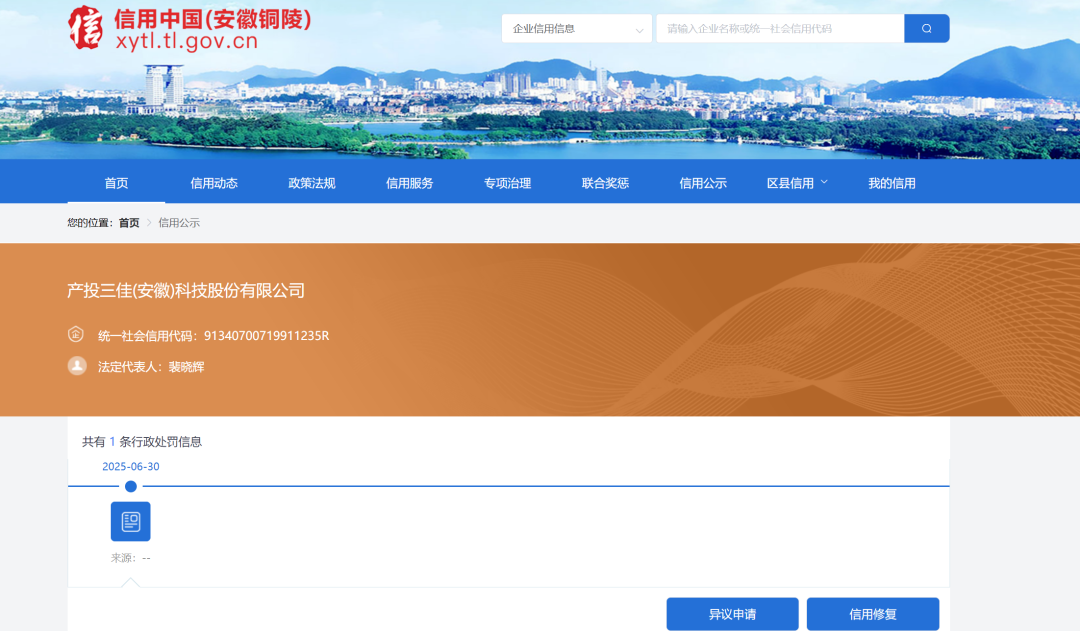 近日,信用铜陵披露行政处罚信息,因安全管理责任不到位等,导致高空坠落事故的发生,产投三佳(安徽)科技股份有限公司被罚五十一万元整,行政处罚决定书文为(铜)应急罚(2025)二-2号。