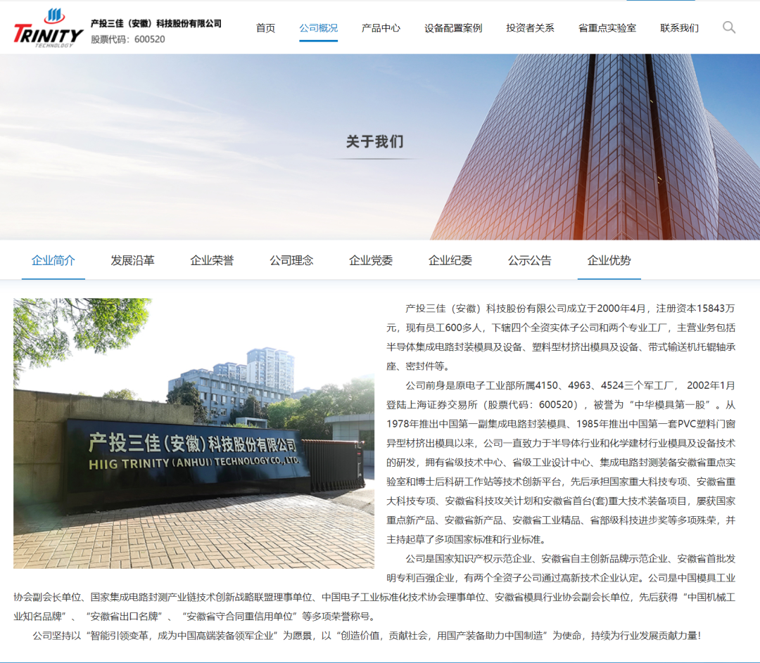 公司官网信息显示,产投三佳(安徽)科技股份有限公司成立于2000年4月,公司前身是原电子工业部所属4150、4963、4524三个军工厂, 2002年1月登陆上海证券交易所(股票代码:600520),被誉为“中华模具第一股”。
