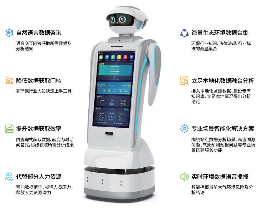 为提升大气监管工作效率和智能化水平,先河环保创新推出环保智能机器人——小蓝博士。通过将实体机器人、软件端及环保大模型相结合,构建AI问答引擎与值守应用系统,为大气监管领域提供实时的语音交互问答与数据协同展示,打造集“监测预警-智能值守-决策支持-智慧问答”于一体的全天候智能终端,助力实现环境监管从“人防”向“智防”的跨越式升级。
