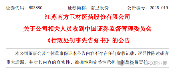 2025年8月8日,上交所主板上市公司南卫股份(维权)(603880.SH)发布了《关于公司相关人员收到中国证券监督管理委员会<行政处罚事先告知书>的公告》。公告称,公司收到江苏监管局下发的《行政处罚事先告知书》,经江苏监管局查明,公司控股股东及实际控制人李平、财务总监项琴华涉嫌内幕交易。李平在内幕信息敏感期内卖出公司股票818.4万股,避损1,177.67万元;项琴华卖出公司股票5.4万股,避损10.17万元。江苏证监局拟对李平没收违法所得1,177.67万元,并处以罚款3,533万元;对项琴华没收违法所得10.17万元,并处以罚款150万元。