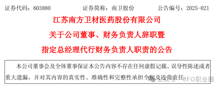2025年8月12日,上交所主板上市公司南卫股份(维权)(603880.SH)发布了《关于公司董事、财务负责人辞职暨指定总经理代行财务负责人职责的公告》(详见后文)。公告显示,董事会于2025年8月11日收到项琴华女士书面辞职报告,项琴华女士因个人原因申请辞去公司第四届董事会董事、财务负责人职务。辞职后,项琴华女士将不再担任公司任何职务。