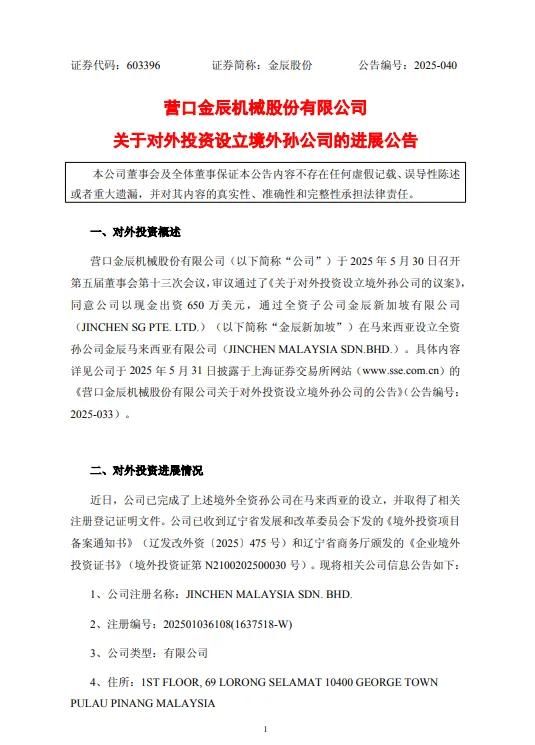 8月5日,金辰股份(603396)公告称,公司于2025年5月30日召开第五届董事会第十三次会议,审议通过了《关于对外投资设立境外孙公司的议案》,同意公司以现金出资650万美元,通过全资子公司金辰新加坡有限公司(JINCHENSGPTE.LTD.)(以下简称“金辰新加坡”)在马来西亚设立全资孙公司金辰马来西亚有限公司(JINCHENMALAYSIASDN.BHD.)。