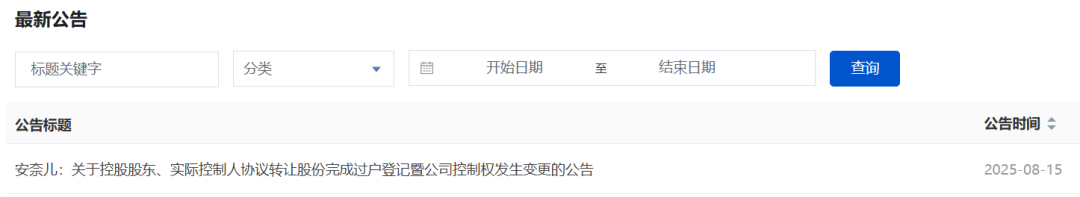 8月15日,深圳市安奈儿股份有限公司(安奈儿,002875)披露关于控股股东、实际控制人协议转让股份完成过户登记暨公司控制权发生变更的公告。