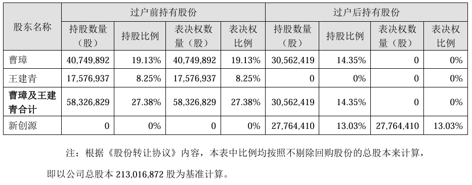 2025年6月9日,公司控股股东、实际控制人曹璋先生、王建青女士与新创源签署了《股份转让协议》。曹璋先生拟向新创源转让其持有的公司无限售条件流通股10,187,473股,占公司总股本的4.78%;王建青女士拟向新创源转让其持有的公司无限售条件流通股17,576,937股,占公司总股本的8.25%。曹璋先生和王建青女士本次合计转让股份27,764,410股,占公司总股本的13.03%。本次股份转让价格为15.21元/股,转让价款合计为人民币422,296,676.10元。