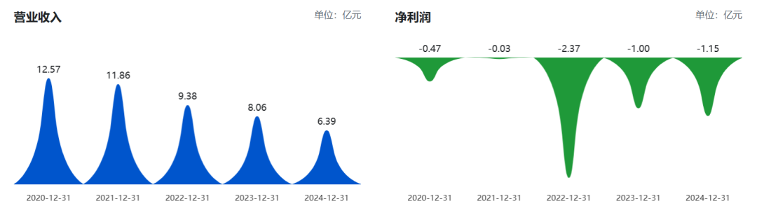自2020年起,公司营业收入持续下滑,从12.57亿元降至6.39亿元;净利润持续为负,5年亏损超5亿元。