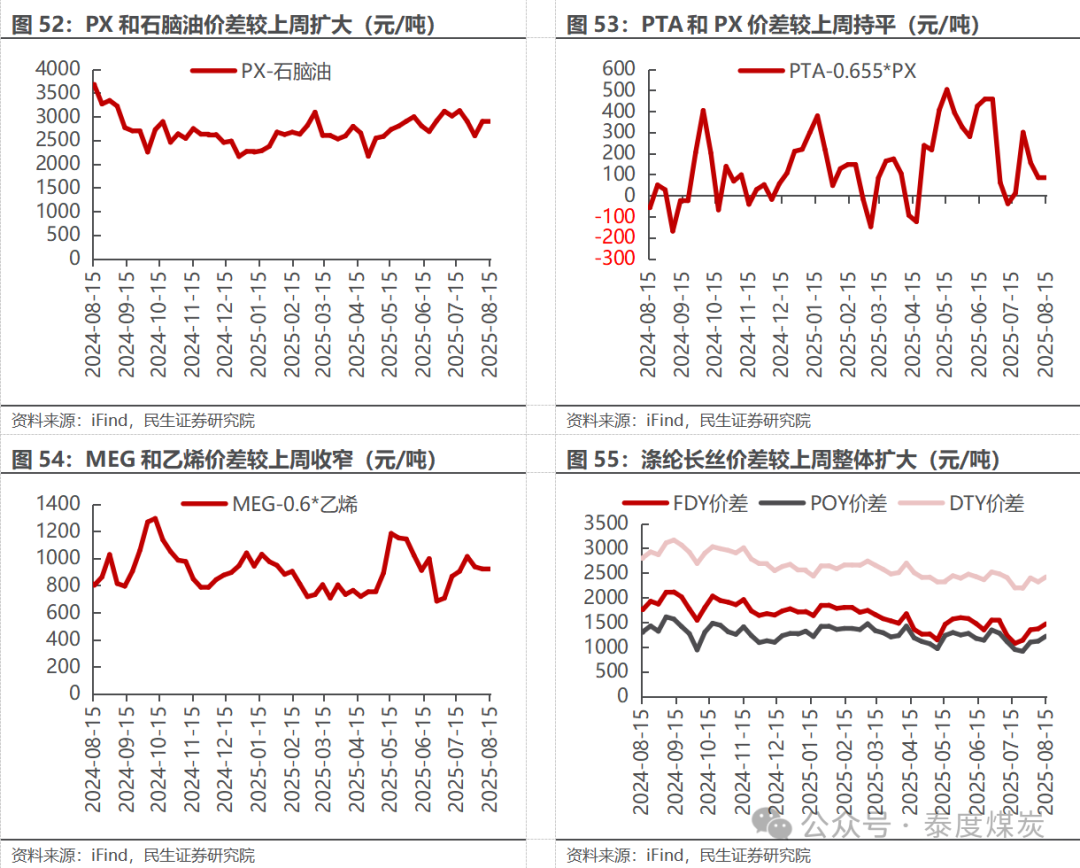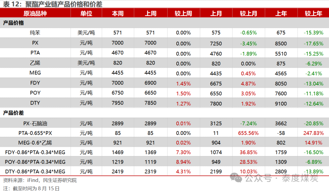 汽油价差收窄,涤纶长丝价差扩大。截至8月15日,1)炼油板块,NYMEX汽油和取暖油期货结算价为1.91/2.22美元/加仑,周环比变化-8.13%/-2.00%,和WTI期货结算价差分别为17.37/30.50美元/桶,周环比变化-25.71%/-2.63%。2)化工板块,乙烯/丙烯/甲苯和石脑油价差分别为254/209/114美元/吨,较上周变化+2.01%/+5.03%/+10.68%;FDY/POY/DTY价差为1469/1219/2419元/吨,较上周变化+7.30%/+8.94%/+4.31%。