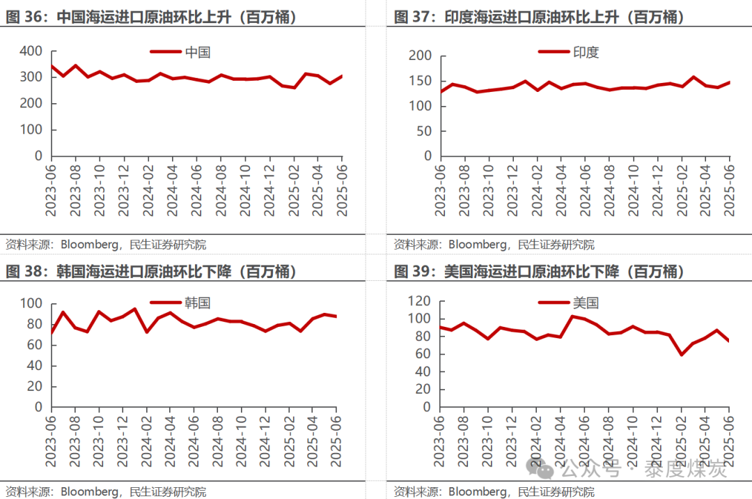 1)海运进口:中国304百万桶,同比上升4.7%,环比上升10.2%;印度147百万桶,同比上升1.6%,环比上升7.4%;韩国88百万桶,同比上升17.3%,环比下降2.1%;美国75百万桶,同比下降25.0%,环比下降13.8%。