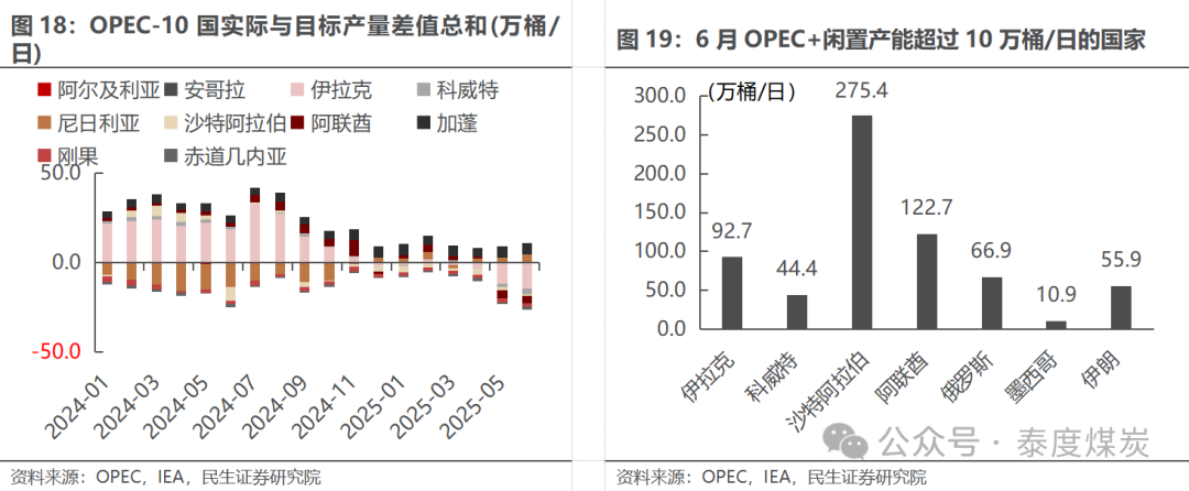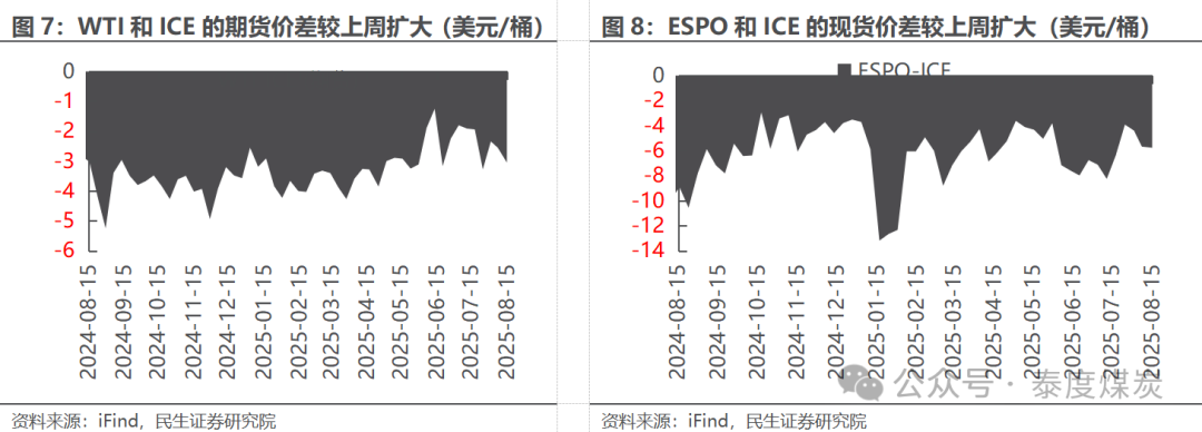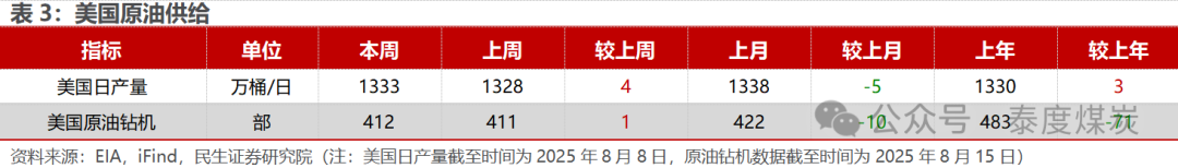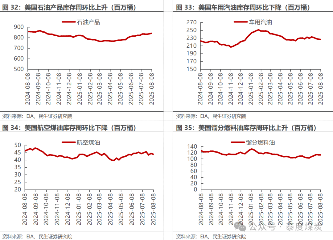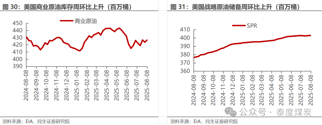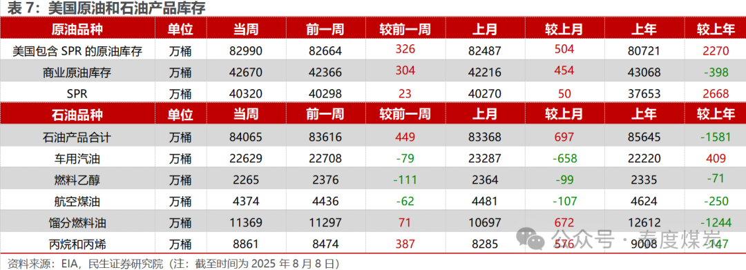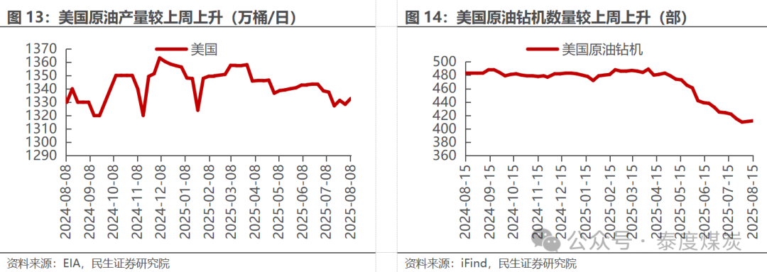 关注美俄会晤结果,油价短期仍具备底部支撑。地缘方面,8月15日,美国总统特朗普和俄罗斯总统普京在阿拉斯加举行会晤,结束后,负责对外投资和经济合作事务的俄罗斯总统特别代表德米特里耶夫表示,普京与特朗普的谈判进展非常顺利;两大核心议题方面,俄乌停火的结果目前尚不明确,俄美关系上、俄罗斯驻华盛顿大使表示俄罗斯已准备好恢复与美国的航班联系的相关文件。基本面方面,据OPEC数据,7月OPEC产量环比增加26.2万桶/日,其中,沙特、阿联酋增产17.0、10.9万桶/日,而伊拉克减产5.1万桶/日,主要是其遵循此前的补偿减产计划,从而二季度以来,在OPEC+大幅增产的背景下,伊拉克产量反而呈现下降趋势。据4月的补偿减产计划来看,伊拉克、科威特、沙特、阿联酋、哈萨克斯坦、阿曼、俄罗斯承诺4-7月累计减产53.5、7.6、1.5、3.5、43.7、4.9、33.9万桶/日,而其在4-7月的产量相比补偿前目标的差值为-49.6、-7.4、-7.5、-6.4、140.3、-3.6、-17.6万桶/日。因此,OPEC+中仅哈萨克斯坦超产严重、且未对补充减产做出行动,其他OPEC+国家对石油组织的共同控产行为则较为支持,同时在美国提产不及预期的背景下,我们预计,无论美俄会晤结果如何,油价短期都具备底部支撑。