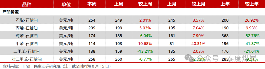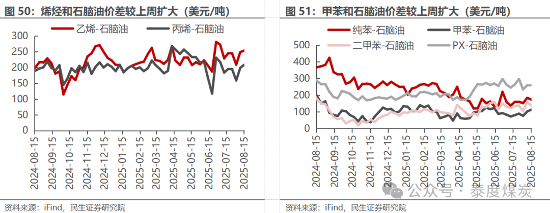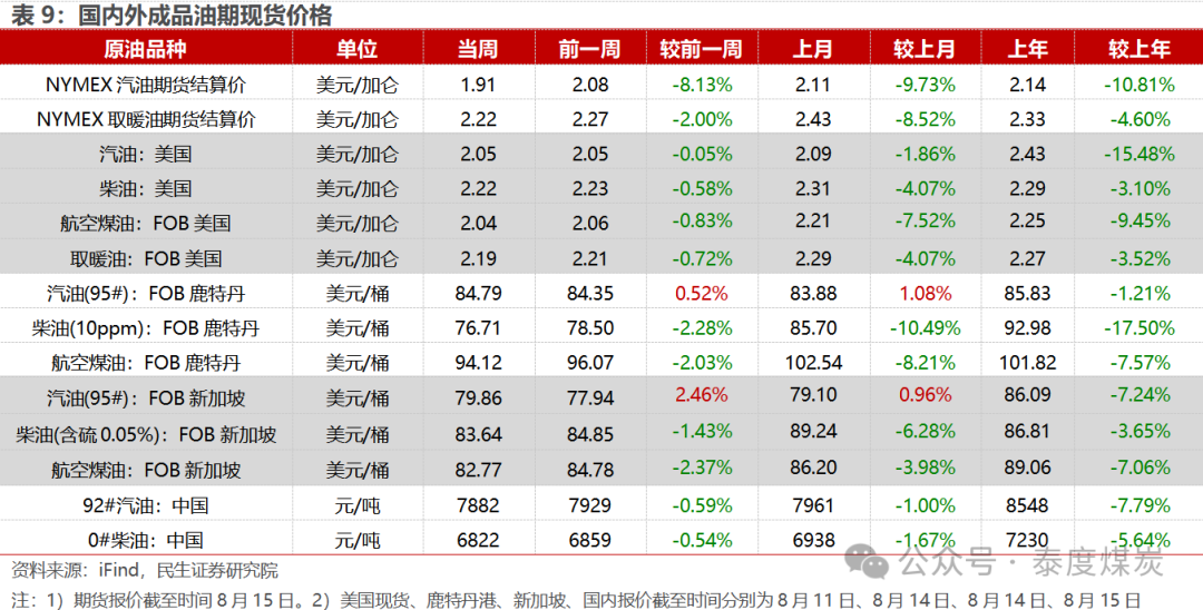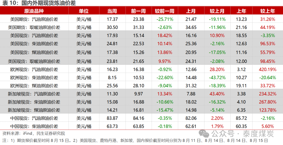 据iFind数据,截至2025年8月15日,国内汽柴油现货价格为7882、6822元/吨,周环比变化-0.59%、-0.54%;和布伦特原油现货价差为83.87、63.73美元/桶,周环比变化-0.35%、-0.18%。