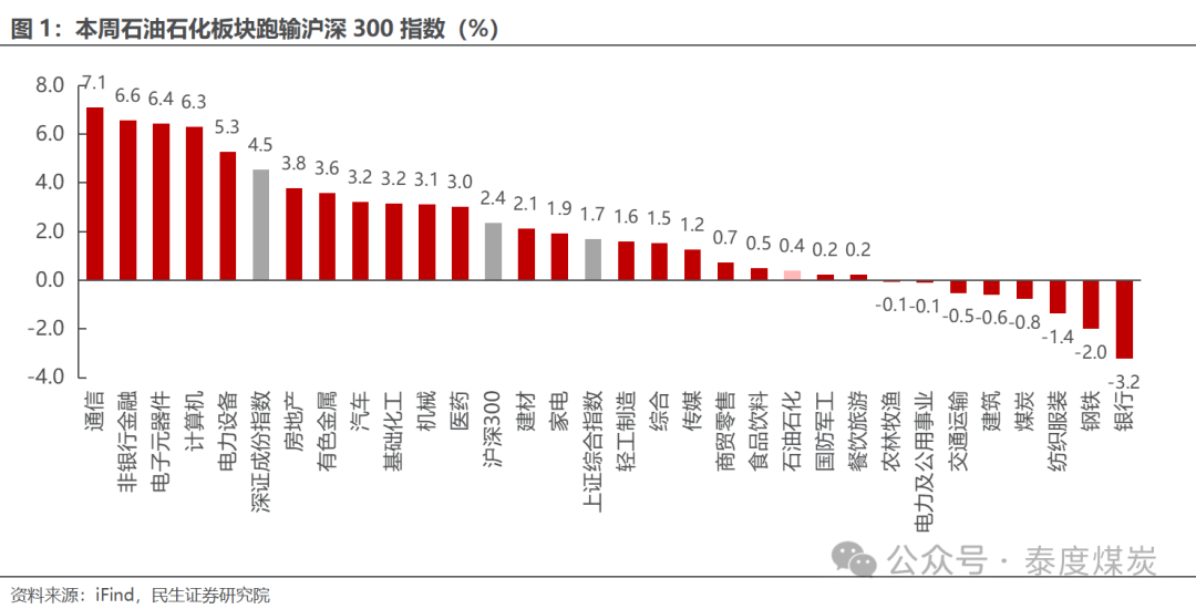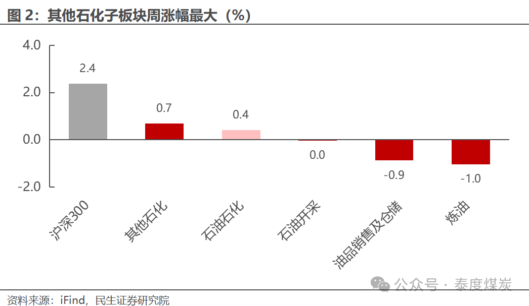截至8月8日,本周沪深300上涨2.4%,中信石油石化板块上涨0.4%。各子板块中,其他石化子板块周涨幅最大,为0.7%;炼油子板块周跌幅最大,为-1.0%。