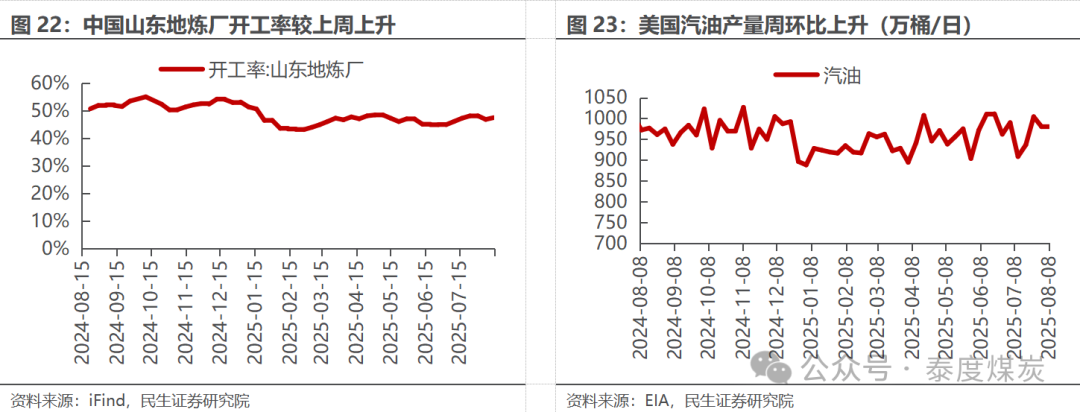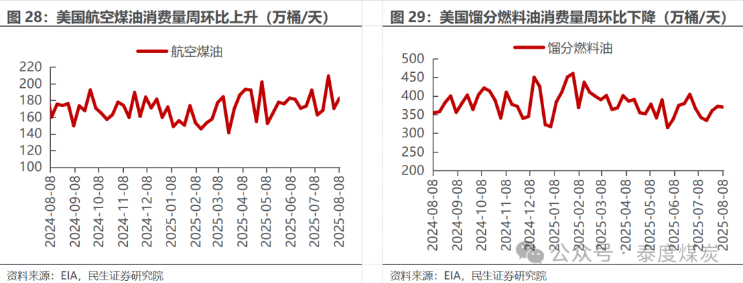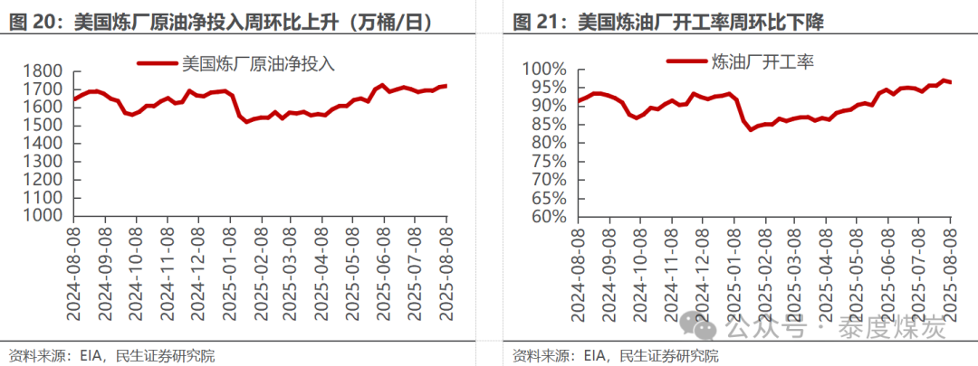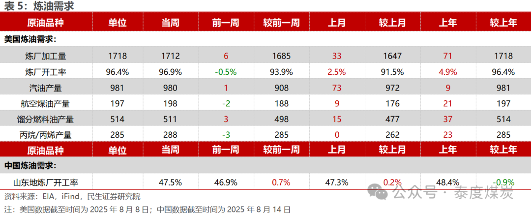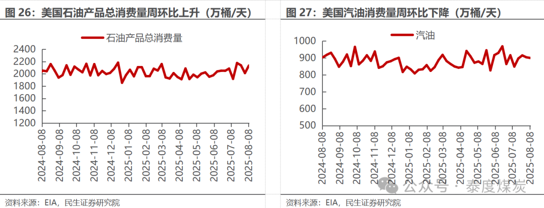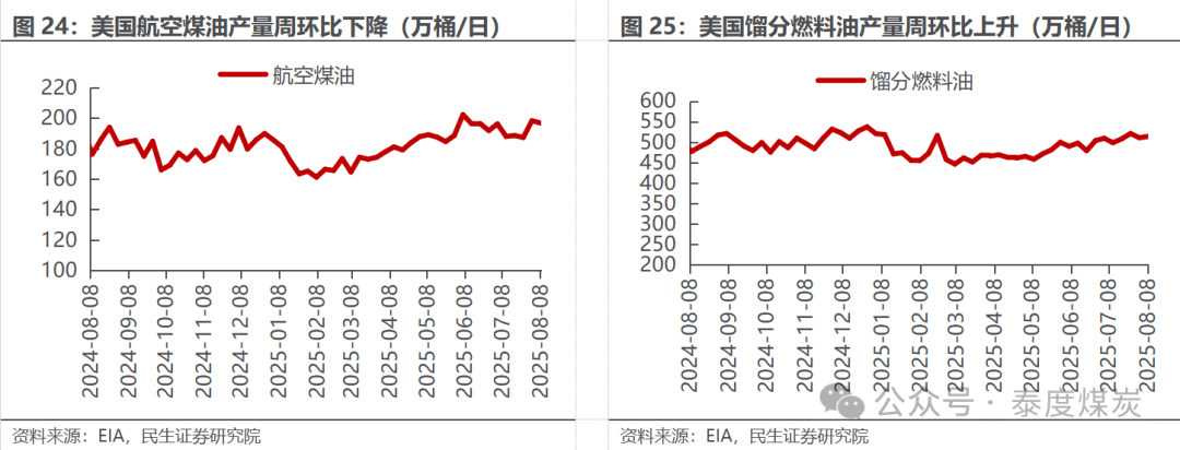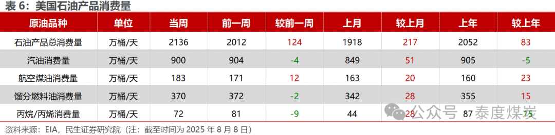 美国原油产量上升,炼油厂日加工量上升。截至8月8日,1)原油方面,美国原油产量1333万桶/日,周环比+4万桶/日。2)成品油方面,美国炼油厂日加工量为1718万桶/日,周环比+6万桶/日;炼厂开工率96.4%,周环比-0.5pct;汽油/航空煤油/馏分燃料油产量分别为981/197/514万桶/日,周环比+1/-2/+3万桶/日。
