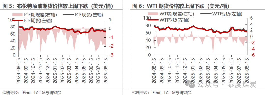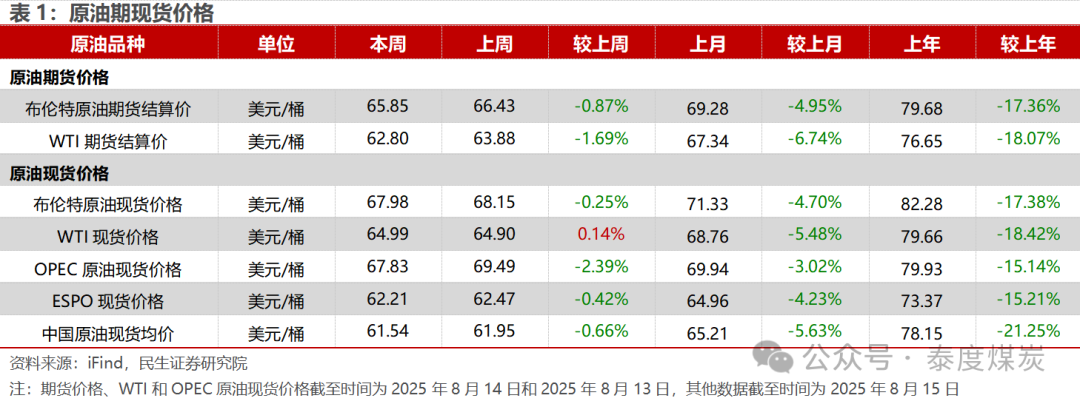 据iFind数据,截至2025年8月15日,布伦特原油期货结算价为65.85美元/桶,较上周下跌0.87%;WTI期货结算价62.80美元/桶,较上周下跌1.69%。