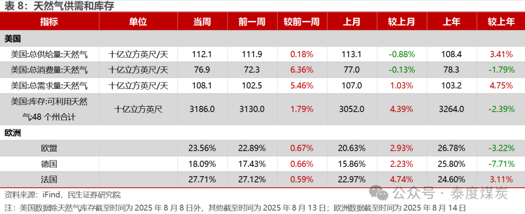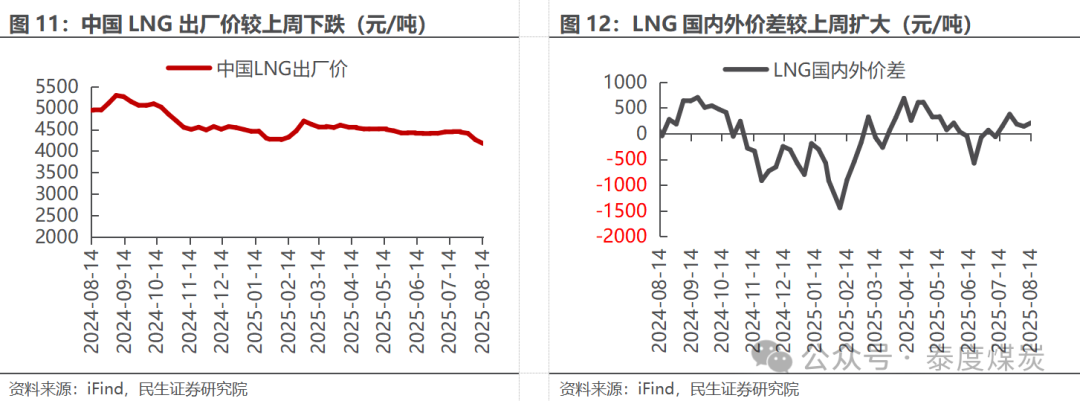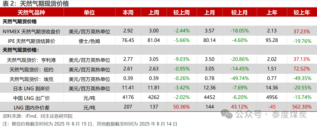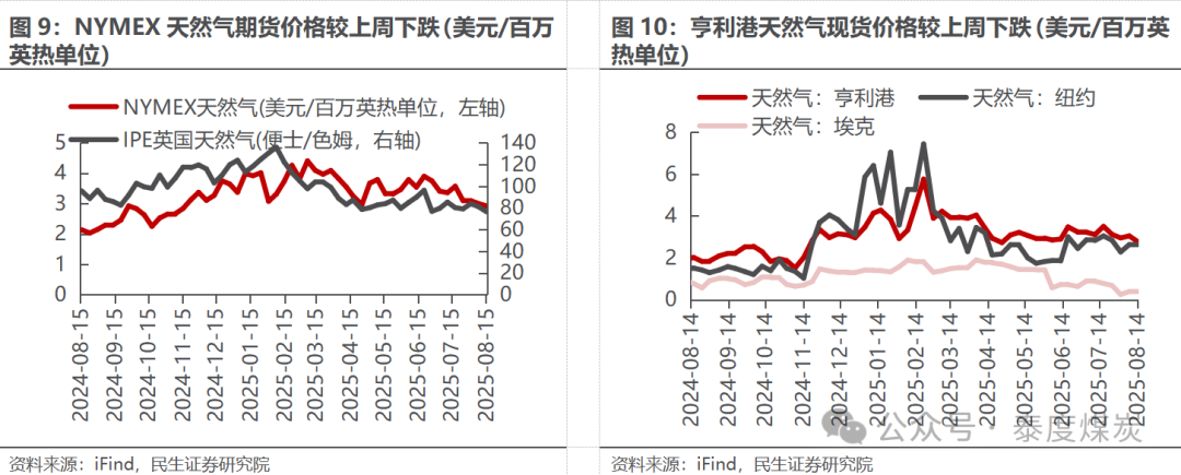 截至2025年8月15日,NYMEX天然气期货收盘价为2.92美元/百万英热单位,较上周下跌2.44%;截至8月7日,东北亚LNG到岸价格11.41美元/百万英热单位,较上周下跌3.42%;中国LNG出厂价为4176元/吨,较上周下跌2.02%。