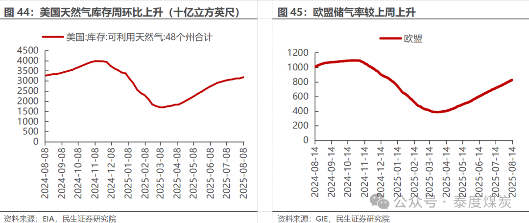 欧盟储气率上升。截至8月14日,欧盟储气率72.95%,较上周+1.98pct。