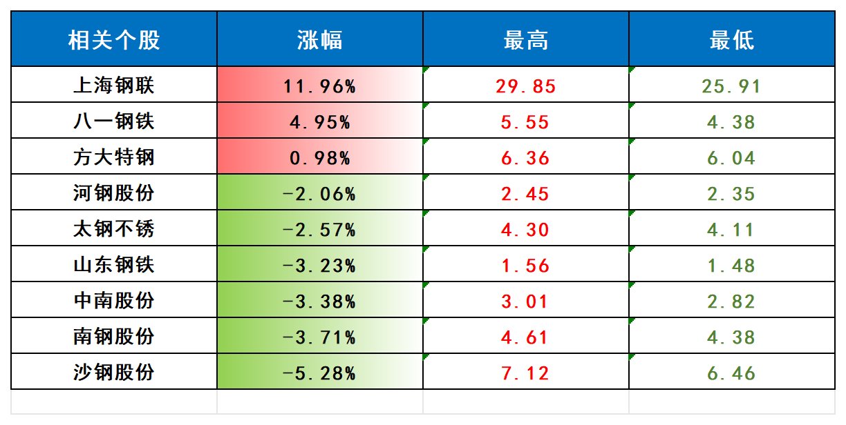 相关个股:中南股份(000717) 河钢股份(000709) 方大特钢(600507) 南钢股份(600282) 新钢股份(600782) 上海钢联(300226) 八一钢铁(600581) 同达创业(600647 )新兴铸管(000778) 三钢闽光(002110) 华菱钢铁(000932) 沙钢股份(002075) 凌钢股份(600231) 太钢不锈 (000825) 中信特钢(000708) 同飞股份(300990)